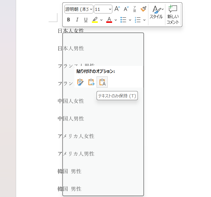 3.Wordで新規作成した白紙文書に貼り付けます。このとき、オプションで「テキストのみ保持」を選びます。