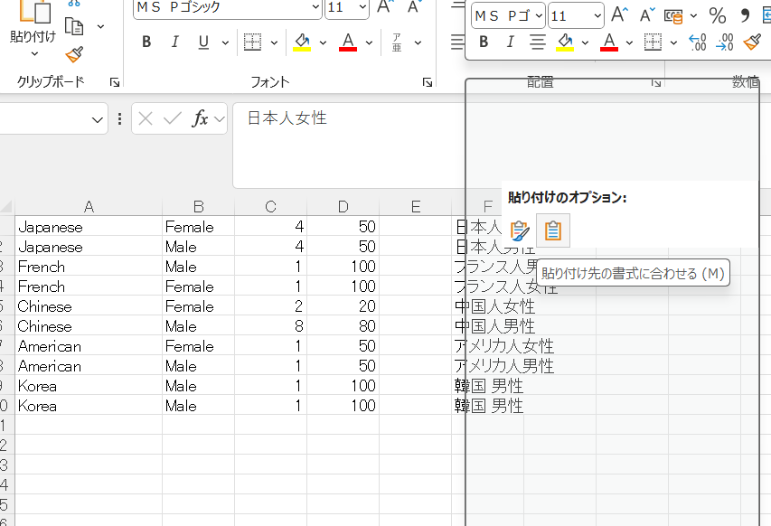 4.Excelの表にもどり、貼り付けます。このとき「貼り付け先の書式に合わせる」とすると、Excel表に影響が少ないのでよいです。